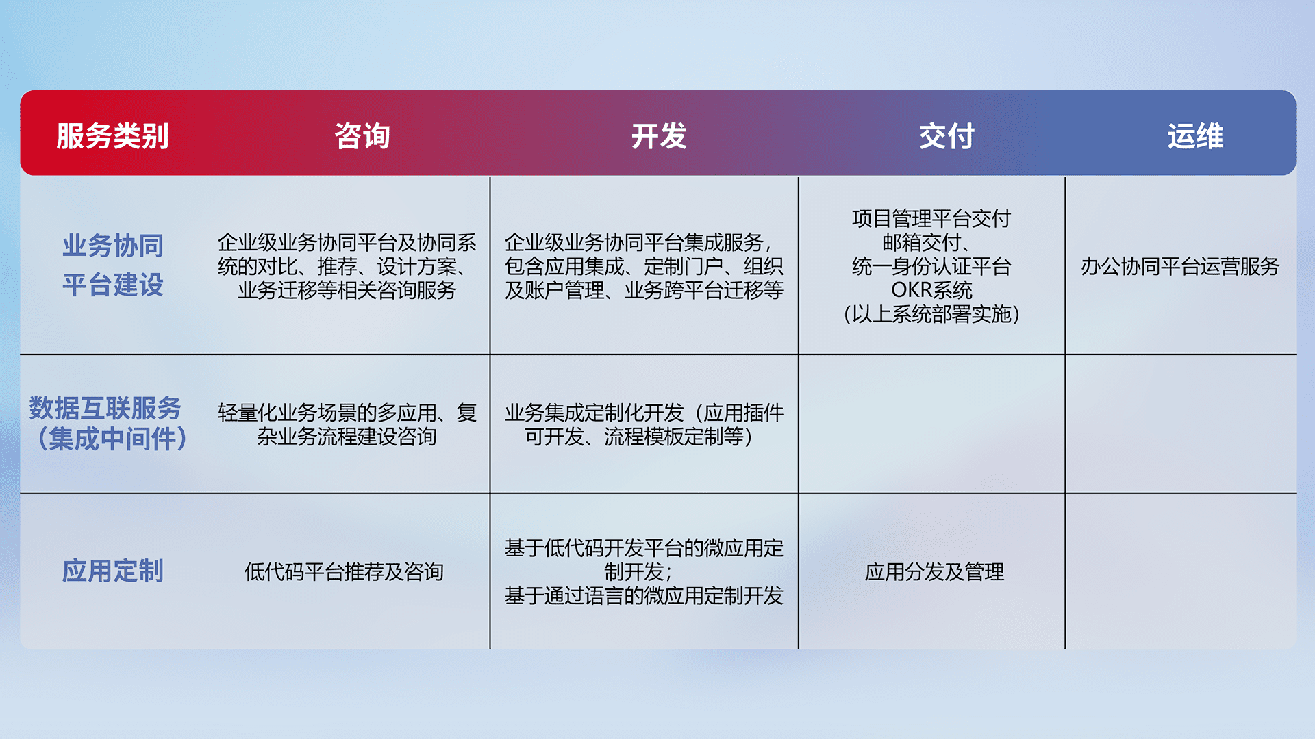 针对钉钉、、、、企微、、、IDaas等平台级产品提供产品的规划、、方案、、、、交付、、、、定制化开发等服务,,,实现如统一协同办公、、、智能客户服务、、、混合会议管理、、、、智能数据查询、、、、等业务场景,,实现数字化转型。。。。