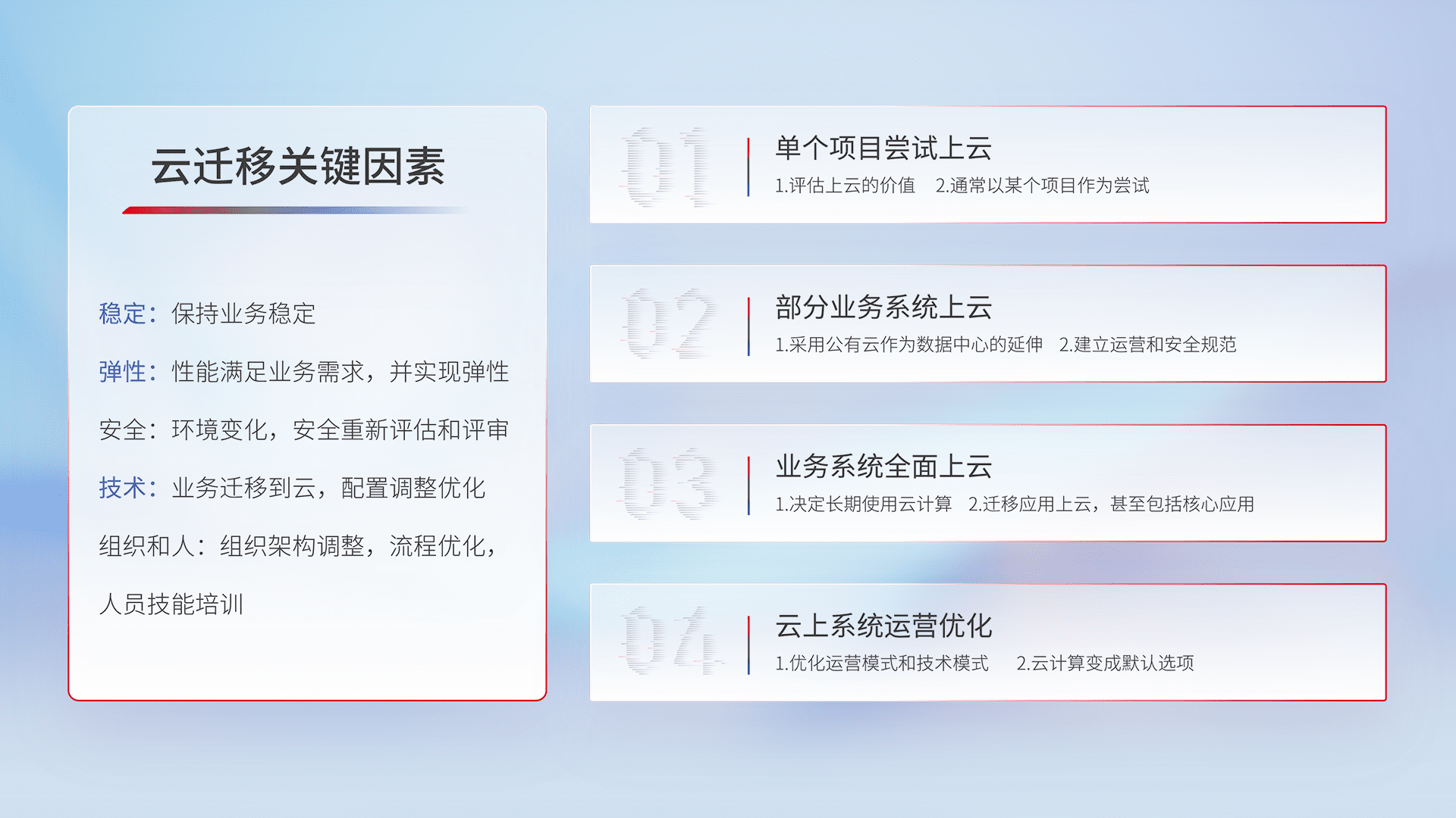 结合实际业务,,,从规划设计、、、云平台选型、、、云原生改造、、、、数据迁移、、、、集成交付,,迁移全过程为客户识别最佳上云路径,,,做好风险识别管理,,,,设计网络架构、、、、身份权限、、、安全审计合规、、、操作审计、、、日志审计、、、监控告警策略、、、多站点容灾设计等,,,对云上基础设施进行整体规划,,提升IT治理水平,,,,以满足弹性、、、高可用、、高性能的需求。。。。