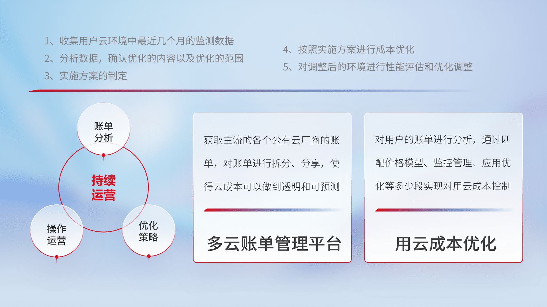 通过多云纳管,,,以统一的资源数据模型把客户的云资源进行抽象和封装,,,进而实现对多云资源的统一操作,,,保障云资源管理的可靠性、、稳定性与可用性。。。。量身定制化运维内容,,配置、、开发运维、、、补丁管理、、备份、、监控、、认证和访问管理、、、、审计和日常巡检等,,保障在用云过程中的可靠度,,,稳定度以及高可用率。。